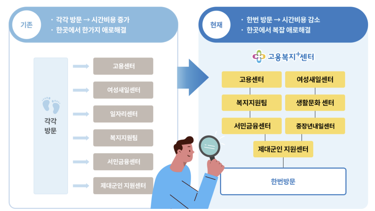 하지만 이제는 그럴 필요가 없습니다. 한 번의 방문으로 여러 기관의 서비스를 한 번에, 한 자리에서 받을 수 있는 고용복지플러스센터가 있기 때문입니다.