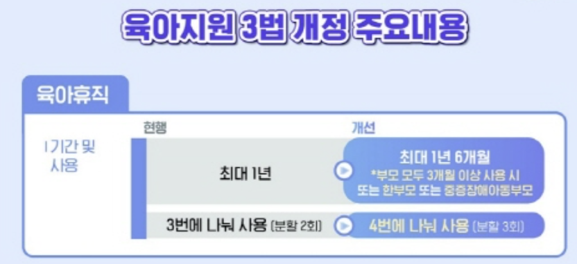 - 개정: 부모가 각각 3개월 이상 사용할 경우, 최대 1년 6개월까지 연장 가능