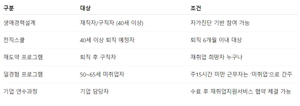 - 재취업, 창업, 전직 등을 위한 맞춤형 프로그램 제공
