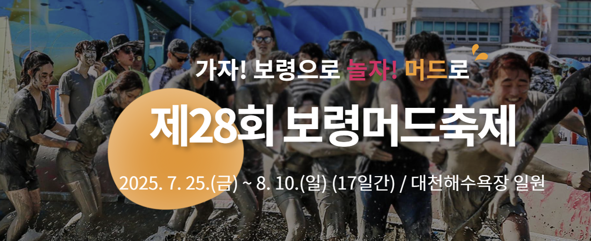 올해로 제28회를 맞는 보령머드축제(2025)는 무더위를 날릴 수 있는 머드 체험존과 워터파크존은 물론, 낮에는 신나는 퍼포먼스와 체험, 밤에는 K-POP 공연, EDM 파티, 불꽃쇼까지 이어지며, 국내외 관광객들에게 특별한 여름 추억을 선사합니다.