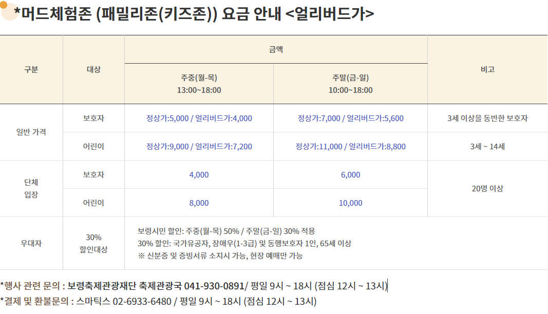 - 예매처: 보령머드축제 예매 페이지
