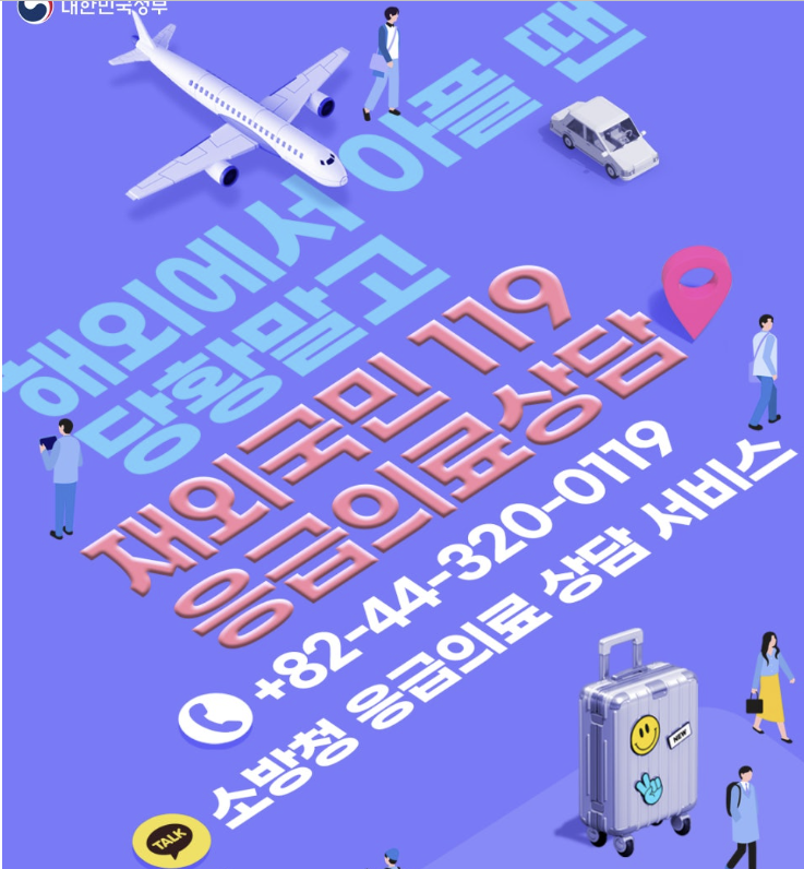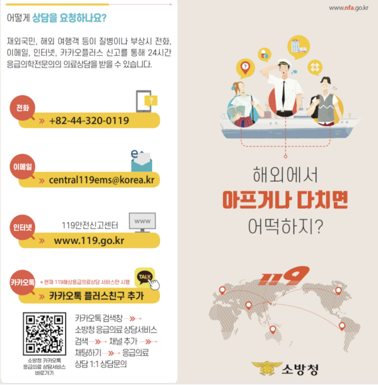 이럴 때를 대비해 소방청에서 운영하는 ‘재외국민 119응급의료상담서비스’를 꼭 알아두셔야 합니다.