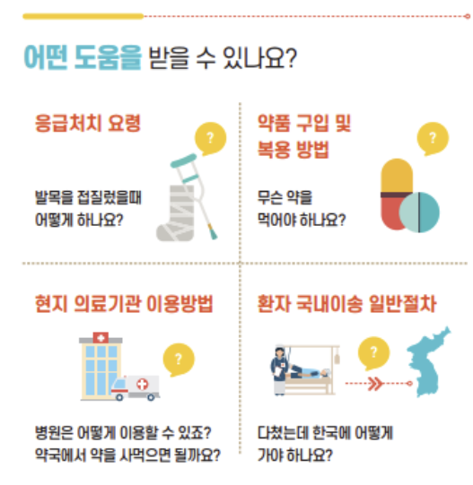 상담을 통해 단순한 의학적 조언을 넘어서, 응급처치 요령, 현지 약품 구입 방법, 병원 이용 가이드, 환자 국내 이송 절차 등에 대한 정보도 안내받을 수 있습니다.