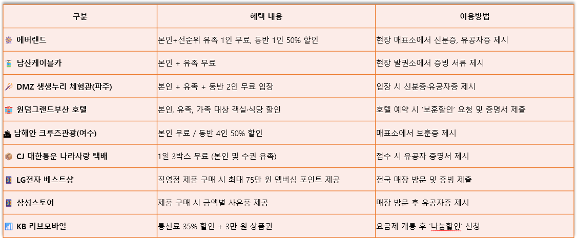 2025년 6월, 보훈대상자와 가족 여러분께 준비된 혜택들을 꼭 활용하셔서 따뜻하고 뜻깊은 시간을 보내시길 바랍니다.