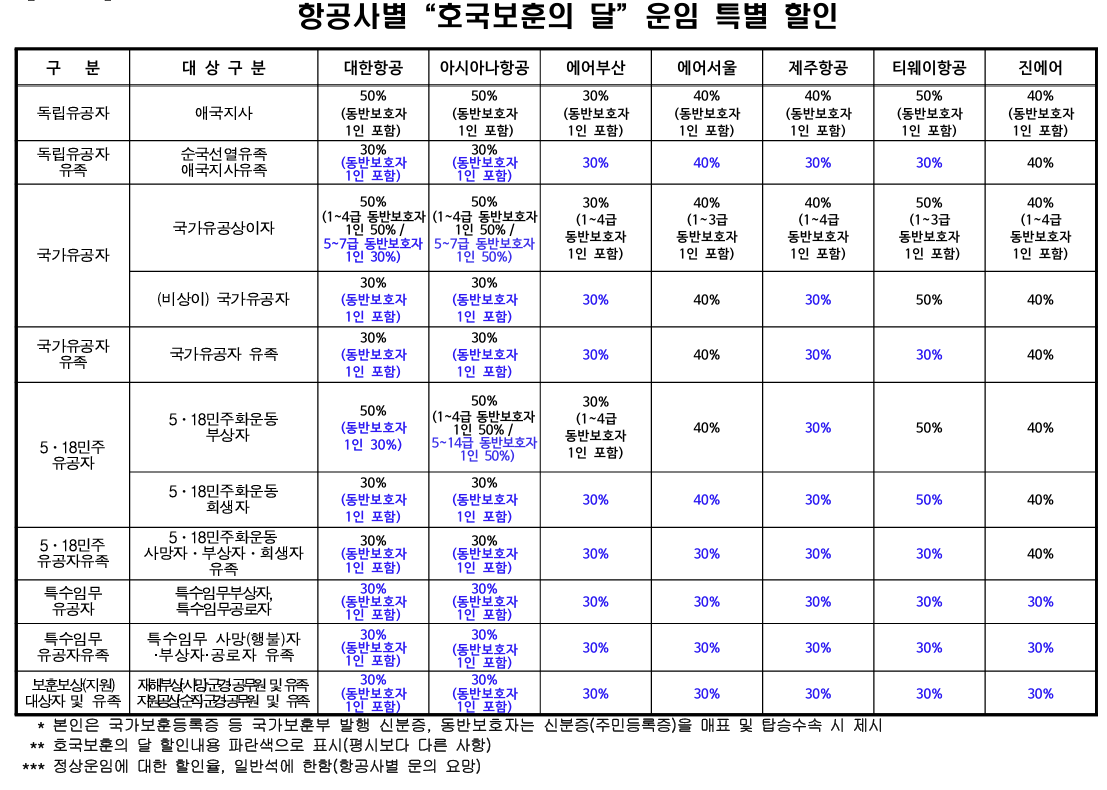 - 대한항공·아시아나항공은 동반 보호자 1인까지 할인 적용