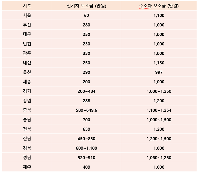 아래는 승용차 기준 지역별 보조금 정리입니다.
