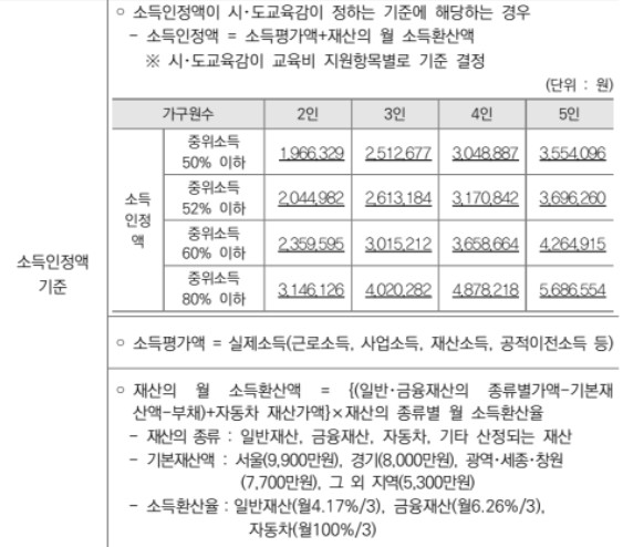 - 가구의 소득인정액이 시·도교육감이 정한 기준 이하면 가능