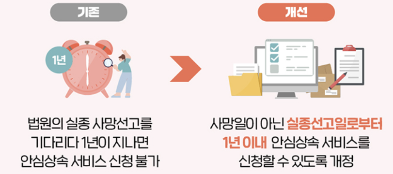 이로 인해 실종사건으로 가족을 잃은 유족분들도 불이익 없이 안심상속 서비스를 이용할 수 있게 되었으며, 신청 가능 기간도 보다 유연해졌습니다. 제도 개선으로 인해 사각지대가 해소되었으며, 사회적으로도 큰 의의가 있습니다.