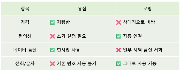 💡 결론: 간편함은 로밍이 우세합니다. 특히 스마트폰 기기에 익숙하지 않은 분들에게는 로밍이 편리합니다.