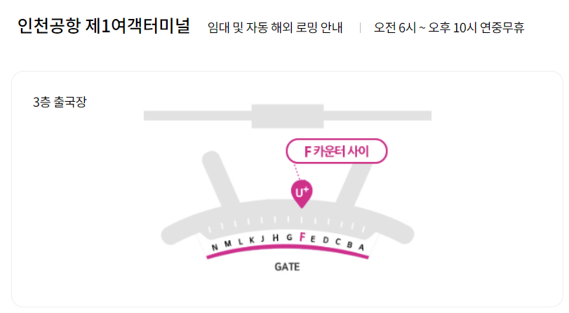 인천공항 1터미널 > 인천공항 1터미널 3층 5월 12일(월)부터 로밍 중에도 유심보호서비스를 이용하실 수 있습니다. 유심 교체 없이 유심보호서비스로 충분하니 안심하고 다녀오시기 바랍니다. 유