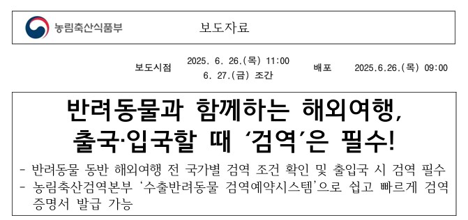 농림축산식품부 보도자료 『반려동물과 함께하는 해외여행, 출국·입국할 때 검역은 필수! (2025.6.26.)』