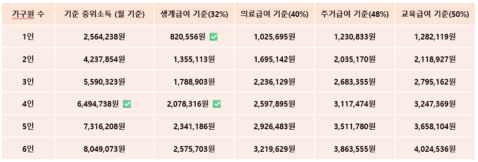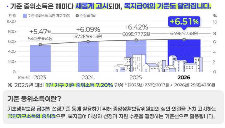 - 4인 가구 기준 중위소득: 6,494,738원 (전년 대비 6.51% 상승)