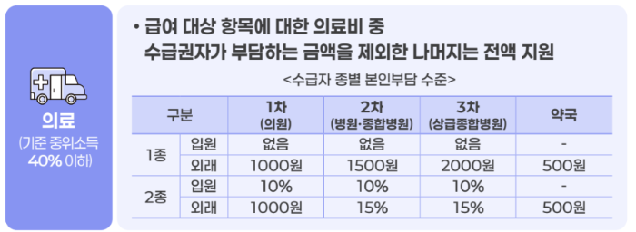 - 혜택: 의료비 본인부담 외 전액 지원 (일부 항목 제한)