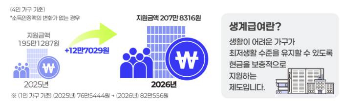 - 4인 가구: 월 최대 207만 8,316원으로 인상