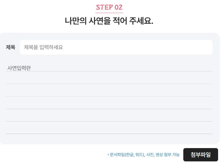 - 2단계: 자유 형식(최대 2,000자)으로 사연 작성 (사진/영상 첨부는 선택)