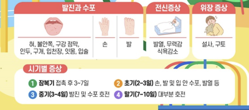 - 초기 (23일): 열이 나고 손, 발, 입안에 수포가 생깁니다. 아이가 물이나 음식을 먹기 힘들어하는 시기입니다.