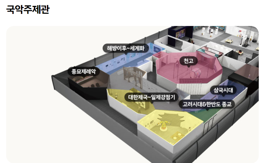 - 국악의 기원과 역사, 현재의 모습, 미래를 아우르는 전시