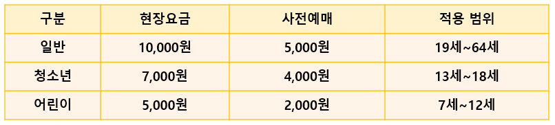 - 일반: 7,000원 / 청소년: 5,000원 / 어린이: 3,000원