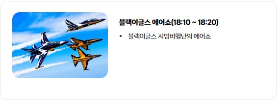 · CIOFF 참가국 공연단체와 퍼레이드 참가자들이 화려한 행진을 선보임 - 블랙이글스 에어쇼 (18:10 ~ 18:20)
