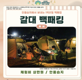 👉 개인 장비 필수이며, 비화식 캠핑(불 사용 금지) 조건이 있습니다. 생태 보존을 위해 최소한의 장비로만 참가 가능합니다.