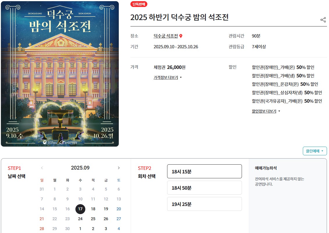 2025년 덕수궁 밤의 석조전은 추첨 응모가 종료되었으며, 현재는 잔여석 일반 예매만 가능한 상황입니다.