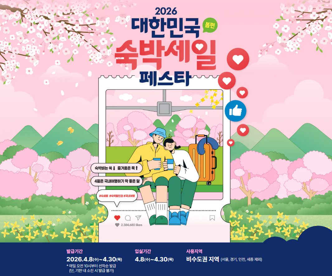 따뜻한 봄 여행을 계획하고 계신다면 반드시 확인하셔야 할 혜택이 있습니다. 바로 2026 대한민국 숙박세일페스타 봄편입니다. 이번 행사는 문화체육관광부와 한국관광공사가 함께 운영하는 대표적인 숙박 할인 정책으로, 비수도권 숙소를 최대 7만원까지 할인받을 수 있는 기회입니다.
