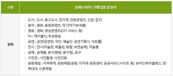 - 도서, 전자책, 영화, OTT 서비스, 공연, 전시, 공예품, 사진 촬영, 문화체험 등