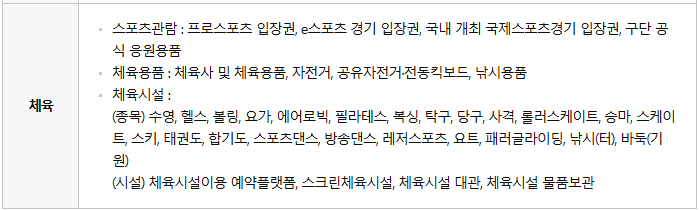 - 헬스장, 수영장, 요가, 필라테스, 스포츠 관람, 체육용품 구매 등