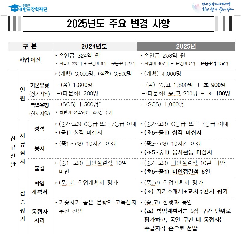 2025년도에는 장학금 제도가 크게 달라집니다. 가장 큰 변화는 선발 대상의 확대입니다.