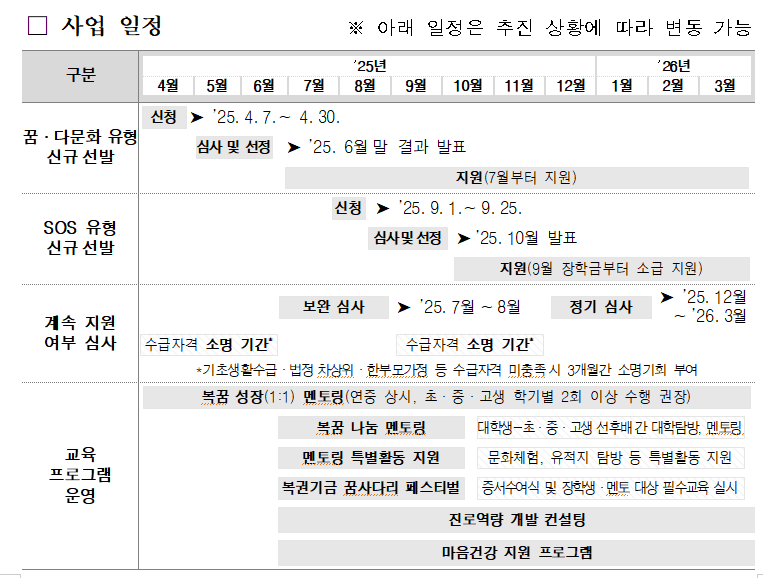 • 지속 지원 체계 강화: 중·고교 시기 장학금 수혜자는 대학 진학 시에도 조건 충족 시 계속 지원 가능