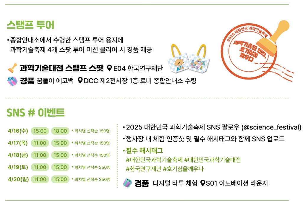 종합안내소에서 수령한 스탬프 투어 용지에 과학기술축제 4개 스팟 투어 미션 클리어시 경품제공