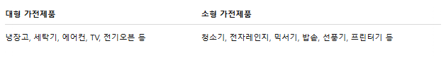 - 대형가전 : 냉장고, 세탁기, 에어컨, TV, 김치냉장고, 전기오븐, 식기세척기 등