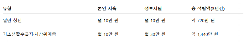 - 일반 청년은 월 10만 원 적립 시, 정부가 추가로 10만 원 적립