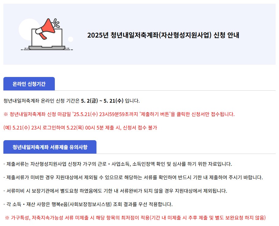 2025년 청년내일저축계좌는 5월 2일부터 5월 21일까지 신청을 받습니다.
