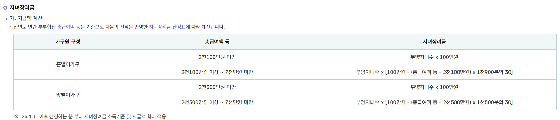정부에서는 저소득 가구의 양육 부담을 줄이고 자녀 양육을 지원하기 위해 자녀장려금 제도를 운영하고 있습니다.