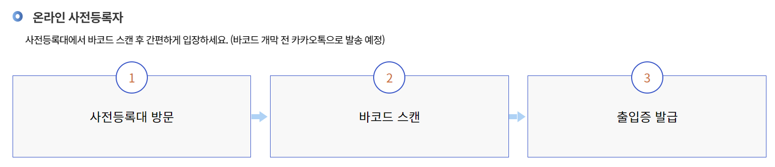 - 온라인 사전등록자 : 사전등록대에서 바코드 스캔 후 입장