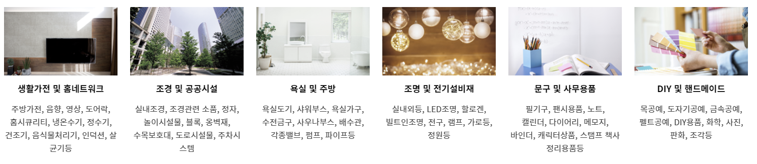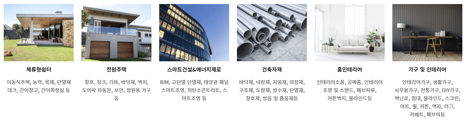 - 국내외 우수 건축자재 : 스마트홈, 건축공구, 인테리어 및 주택설계시공, 홈인테리어 등