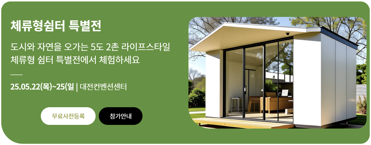 - 농촌체류형쉼터 특별전 : 체류형쉼터, 이동식주택, 방법 및 안전관리 시스템 등