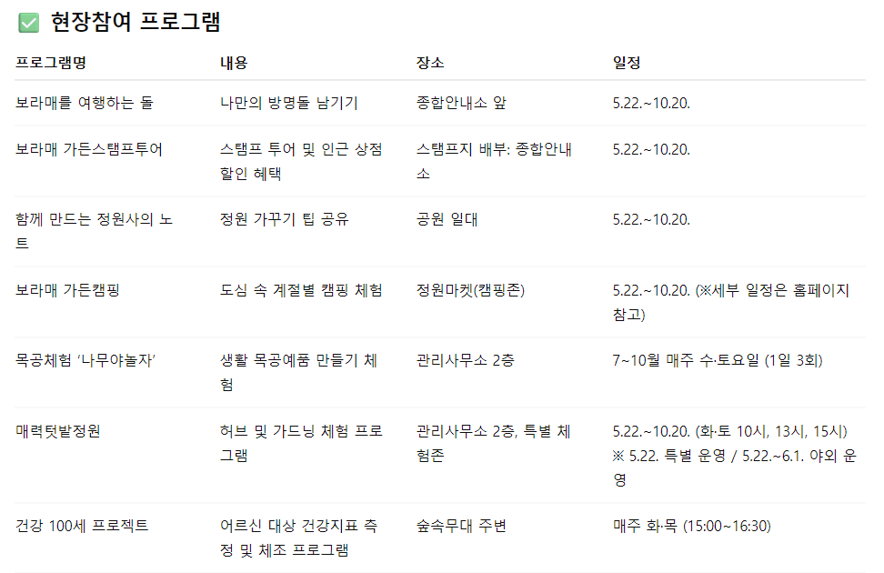 보라매공원에서는 박람회 기간 동안 정기적으로 다양한 체험 프로그램이 운영됩니다. 사전 신청이 필요한 프로그램과 현장 참여가 가능한 프로그램이 혼합되어 있어 누구나 편하게 즐기실 수 있습니다.