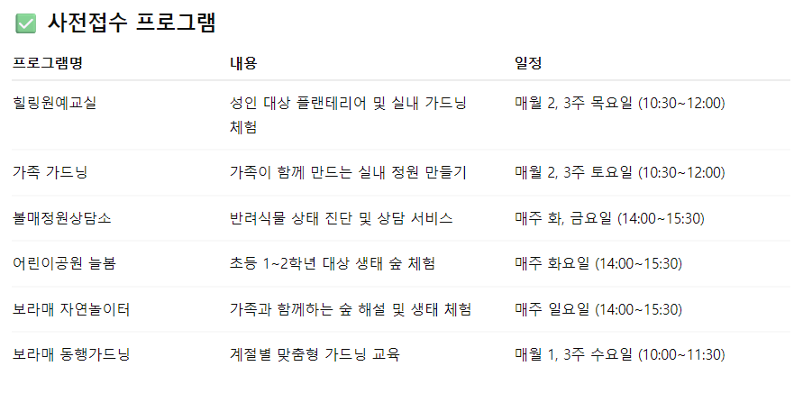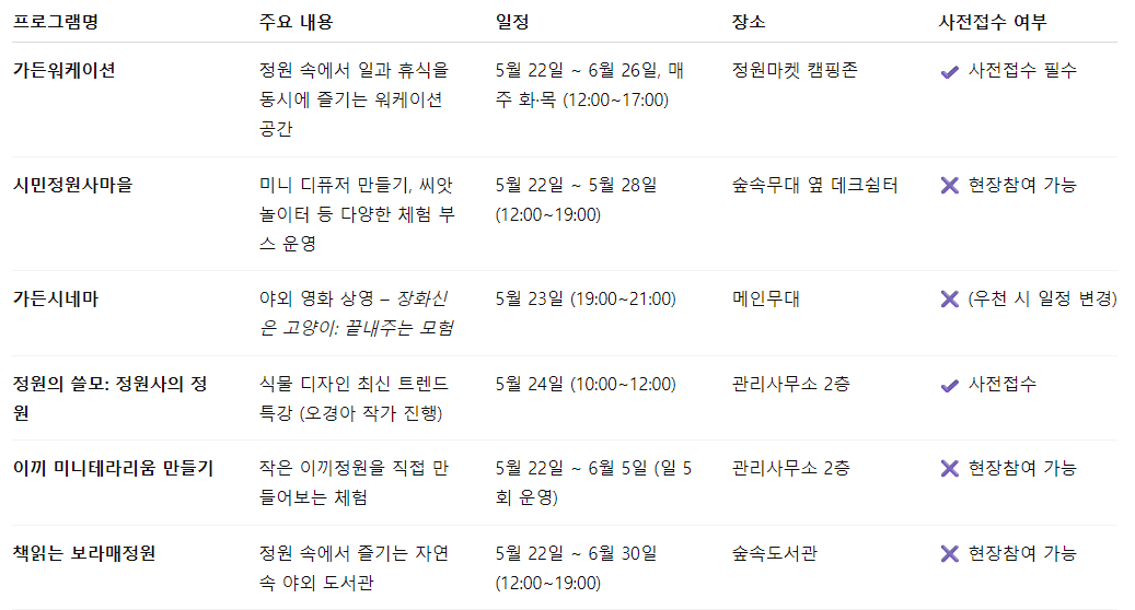 • 정원문화프로그램: 정원 해설투어, 자연공예 체험, 시민정원사 워크숍, 아동 대상 식물 체험 등 다채롭게 구성됩니다.