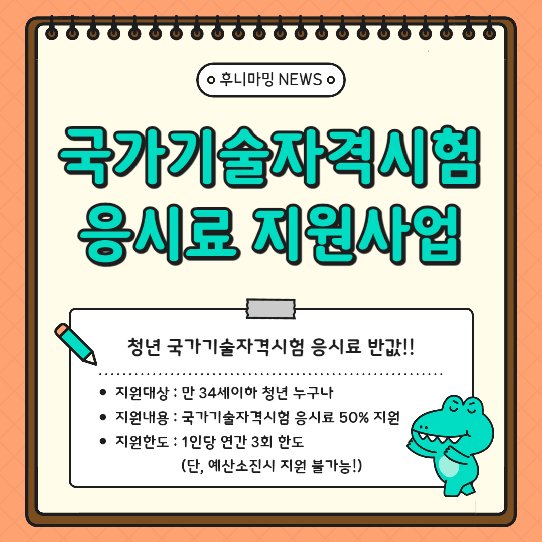‘청년 국가기술자격시험 응시료 지원사업’은 만 34세 이하 청년에게 자격시험 응시료의 50%를 지원하는 정부 정책입니다.