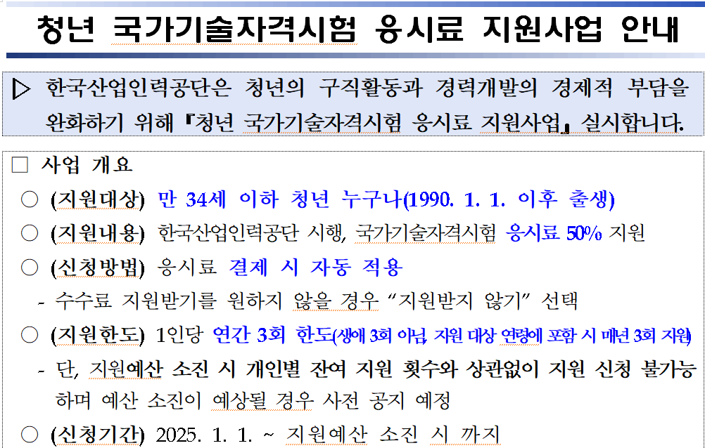 오늘은 2025년에도 계속 운영 중인 ‘청년 국가기술자격시험 응시료 지원사업’에 대해 쉽고 구체적으로 정리해드리겠습니다.