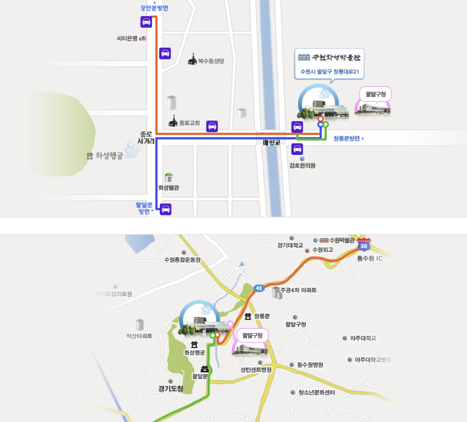 팔달구청, 수원화성박물관 하차: 2-2, 7-2, 60, 400, 400-4, 700-2, 1, 1007
