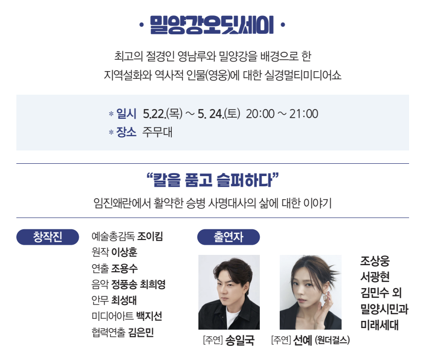 밀양강과 영남루를 배경으로 지역설화와 역사적 인물의 삶에 대해 펼쳐지는 실경 스펙터클 뮤지컬쇼로, 매년 밀양아리랑대축제의 하이라이트로 손꼽히는 프로그램입니다.