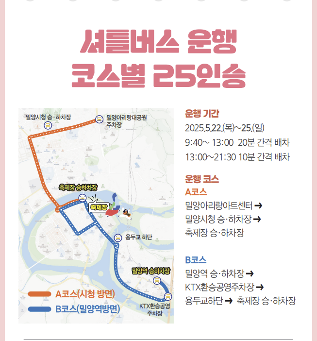 - 밀양역 ↔ KTX환승 공영주차장 ↔ 용두교 하단 ↔ 축제장