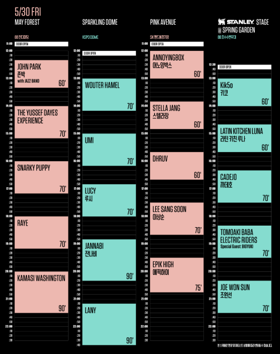 각 공연장의 입장 시작 시간은 날짜별로 상이하므로, 타임테이블을 미리 확인해주세요.
