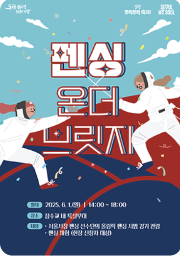 - 내용: 한강 교량 위 최초의 스포츠 이벤트! 잠수교 위에서 서울시 펜싱선수단의 시범경기가 펼쳐집니다.