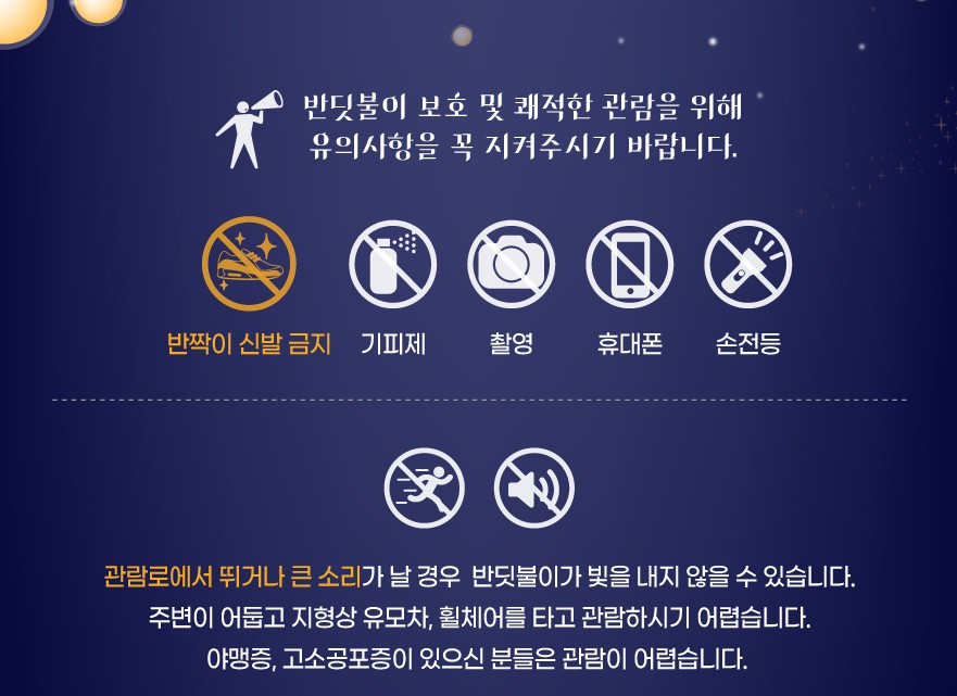 스마트폰 플래시, 손전등, 헤드랜턴 등은 사용이 금지되며, 사진 촬영 시에도 플래시는 꺼주시기 바랍니다.